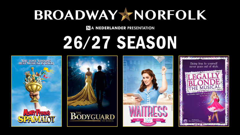 The season kicks off in October with SPAMALOT. Lovingly ripped off from the film classic, Monty Python and the Holy Grail, this musical has everything you need for a great knight at the theatre–from flying cows to killer rabbits, British royalty to French taunters, dancing girls, rubbery shrubbery, and of course, the Lady of the Lake. THE BODYGUARD makes its Norfolk debut in November.Based on the 1992 film starring Whitney Houston and Kevin Costner, THE BODYGUARDis a thrilling, romantic musical that combines high-stakes suspense with unforgettable music. THE BODYGUARD features a host of unforgettable classics, including “Queen of the Night,” “So Emotional,” “I Will Always Love You,” “I Wanna Dance with Somebody,” “Saving All My Love,” and “One Moment in Time.” Back by popular demand, WAITRESS rings in the new year in January. Inspired by the beloved film and featuring music by Grammy® Award winner Sara Bareilles, WAITRESS tells the story of Jenna, an expert pie maker who dreams of a way out of her small town. The fabulously fun and internationally award-winning LEGALLY BLONDE closes out the 2026-2027 season in March. The story follows the transformation of Elle Woods as she tackles stereotypes, sexism, snobbery, and scandal in pursuit of her dreams, and proves that you can be both legally blonde AND the smartest person in the room. Based on the iconic movie, LEGALLY BLONDE will take you from the sorority house to the halls of justice with Broadway’s brightest heroine and, of course, her Chihuahua, Bruiser.